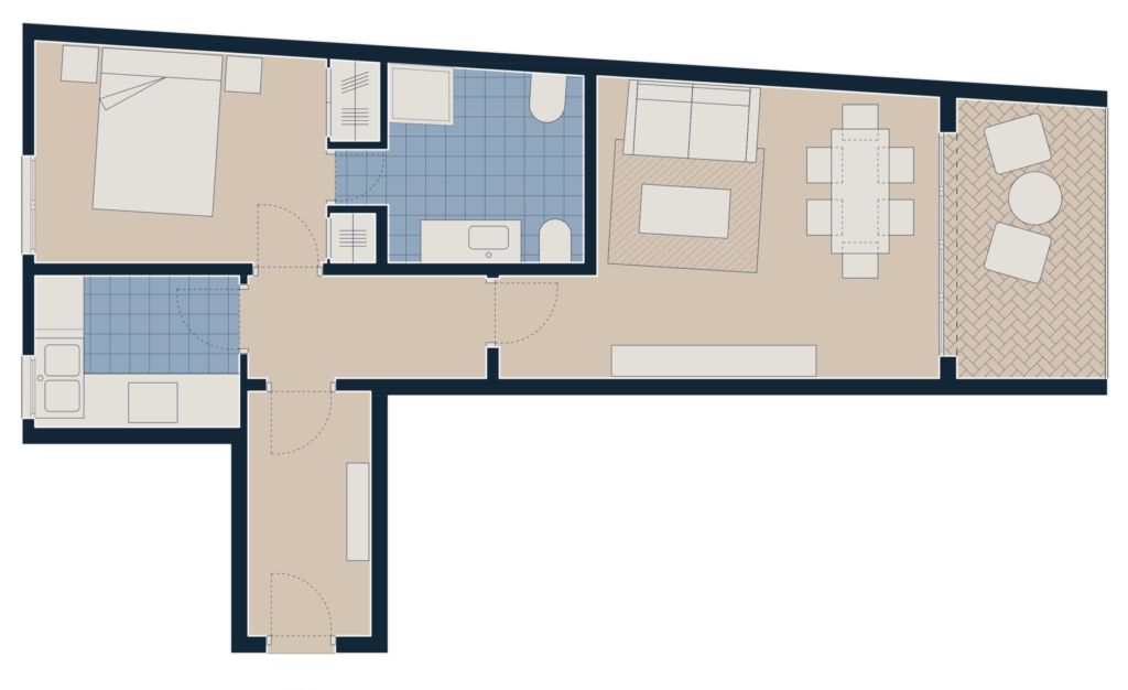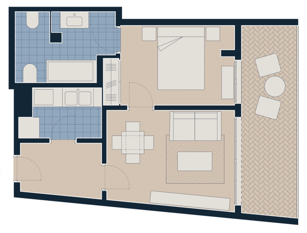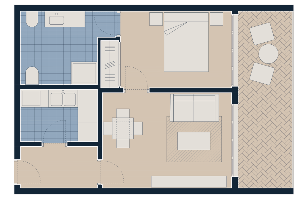 One-bedroom apartments with terrace, with an occupancy of 2 people and between 56 and 68 m².